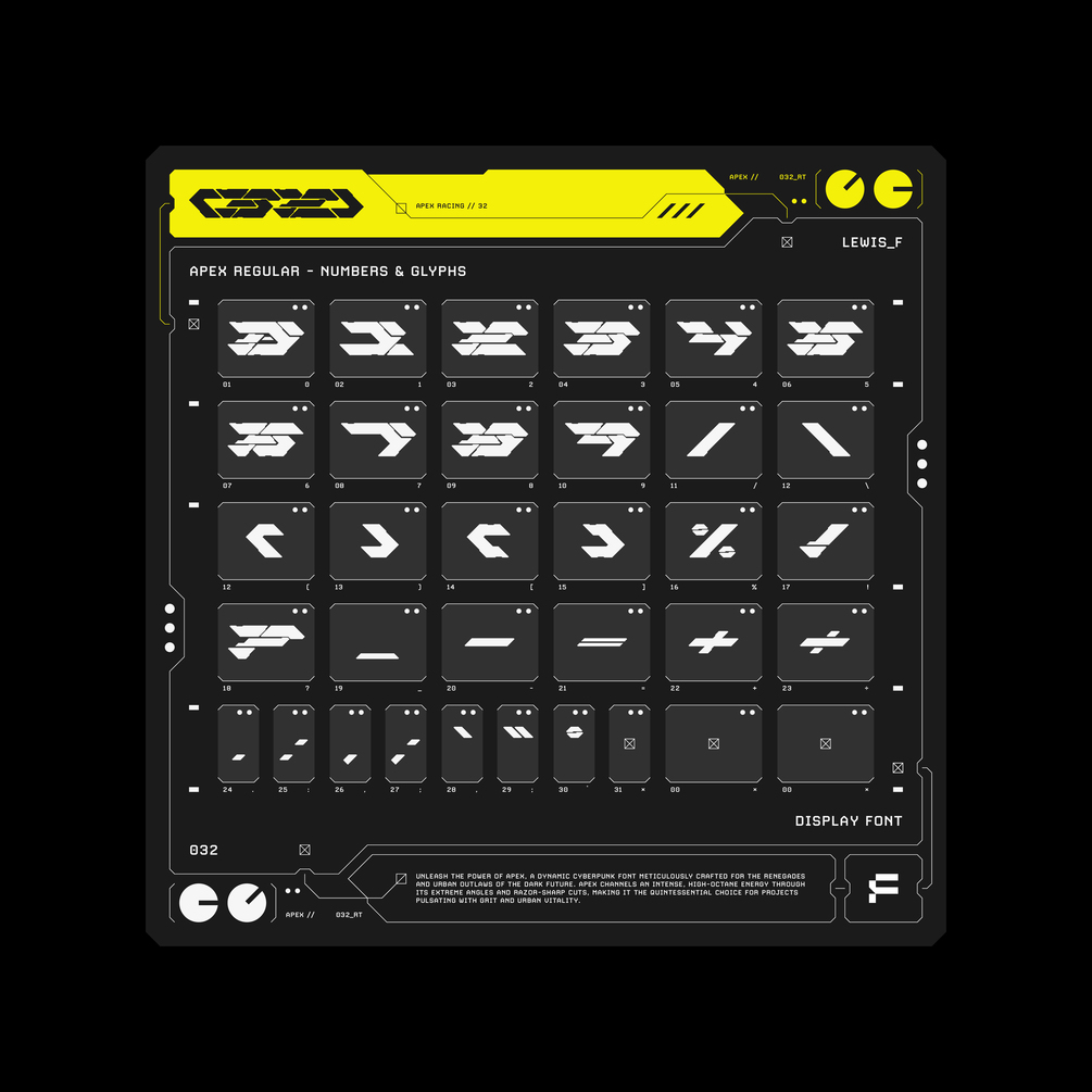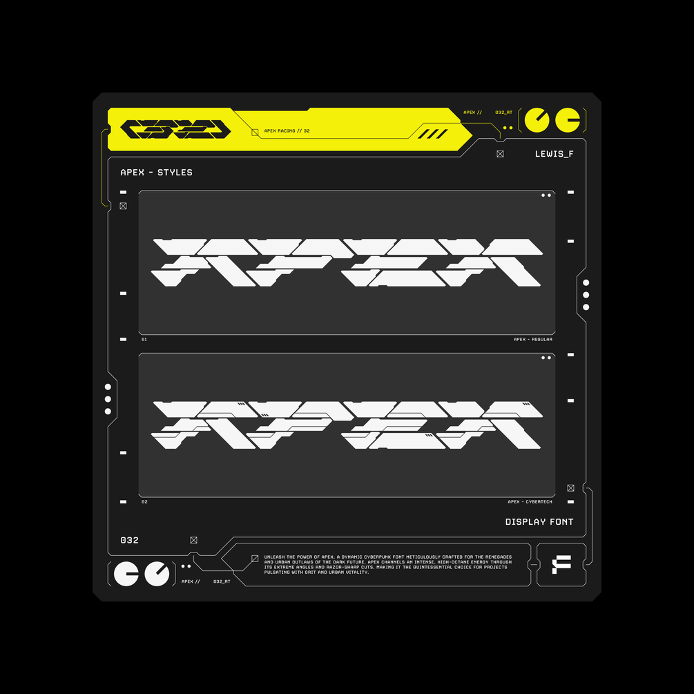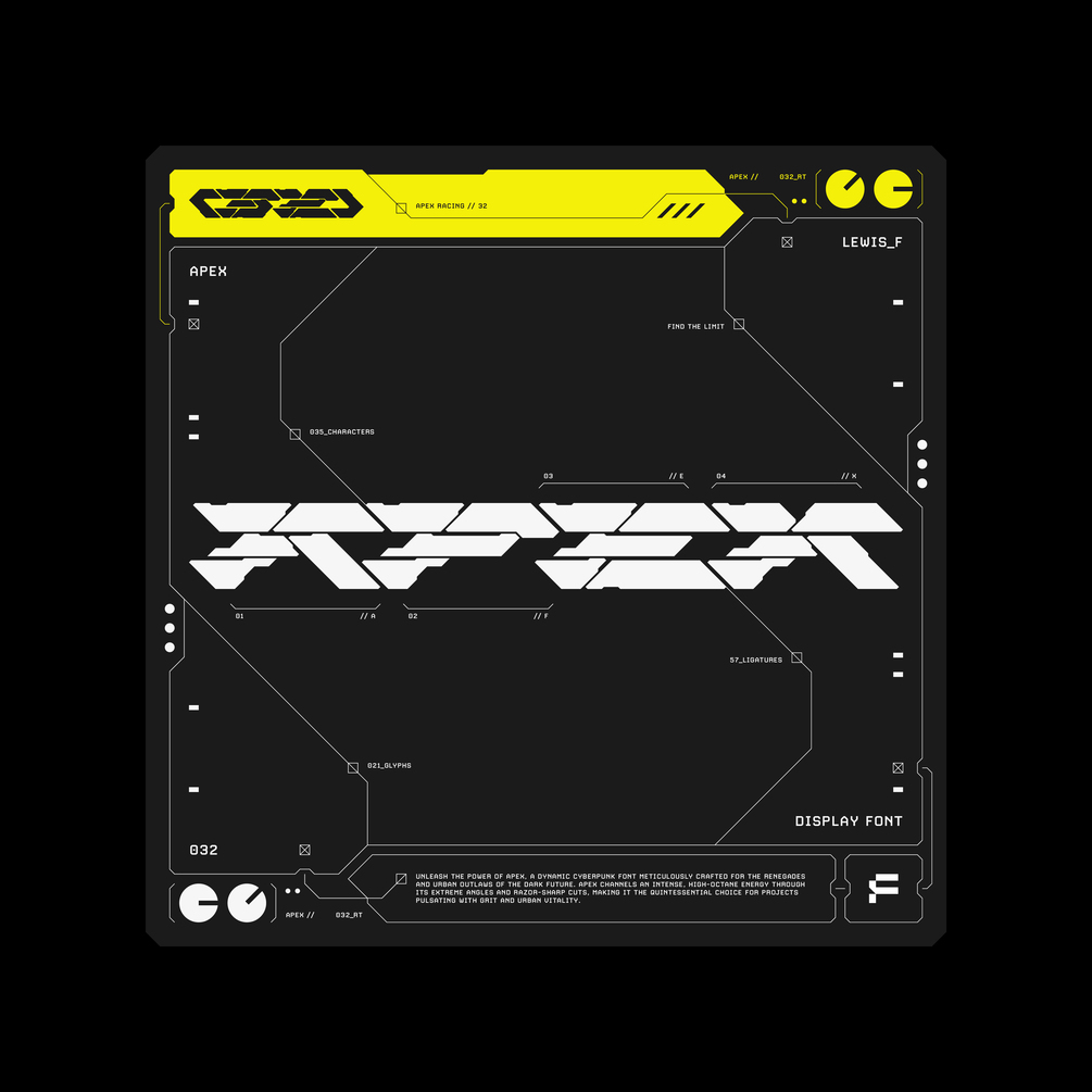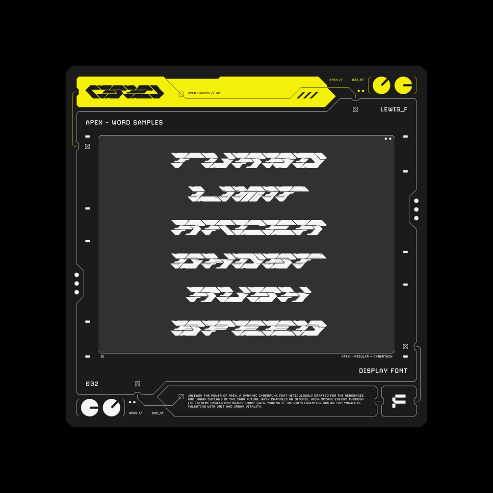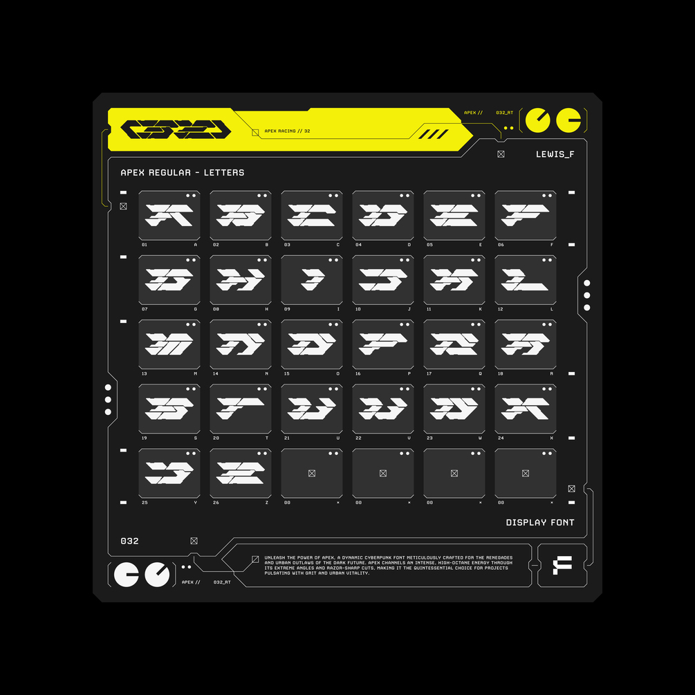 Unleash the power of APEX, a dynamic cyberpunk font meticulously crafted for the renegades and urban outlaws of the dark future. APEX channels an intense, high-octane energy through its extreme angles and razor-sharp cuts, making it the quintessential choice for projects pulsating with grit and urban vitality.