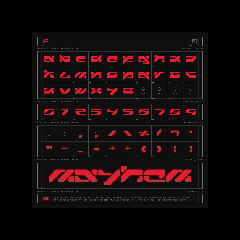 Mayhem, a futuristic display font, drawing inspiration from the cyberpunk aesthetic while embodying the fusion of disorder, chromatic rock, and cybernetics. With its bold strokes and precise cuts, Mayhem prioritises style, adding a rebellious touch to any design. This font is the perfect choice for those seeking to evoke the dystopian future in their projects. Whether it’s creating eye-catching posters or designing captivating album covers and apparel lines, Mayhem delivers a brilliantly unique look. Pair it with MXM, and unleash the full potential of the cyberpunk world in your designs.